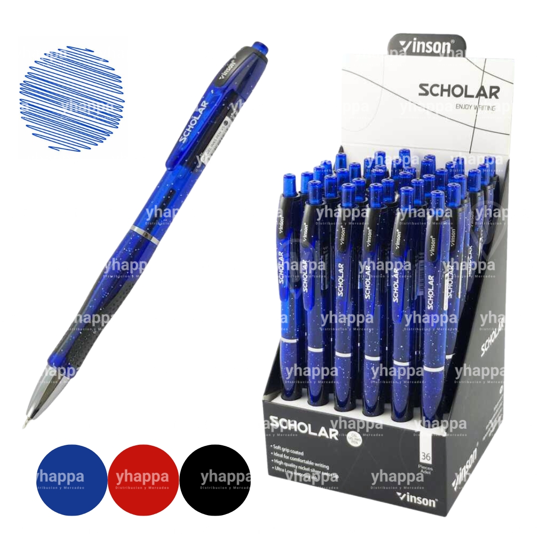 Presentación en exhibidor de 36 unidades en colores variados: rojo, azul y negro (R-A-N), perfecto para surtir oficinas, tiendas y aulas.